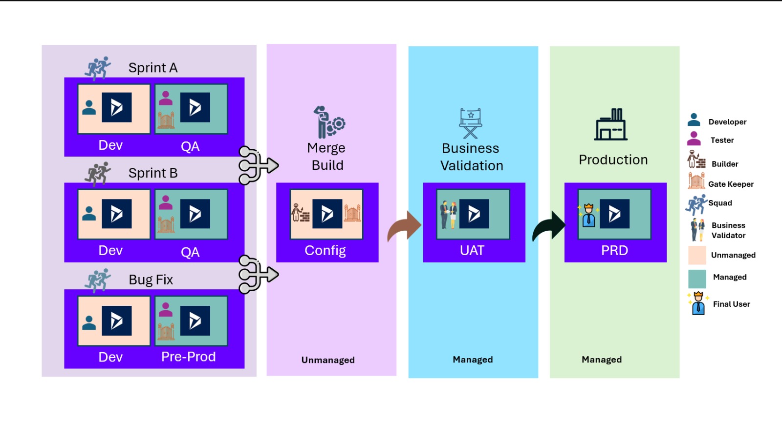 Structured Dev / Test / UAT / Production environments with clear promotion paths and access controls at every stage.
